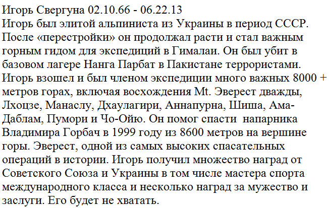 Igor was one of the top climbers from Ukraine during the USSR period. After ÒperestroikaÓ he continued to climb and became a sought after mountain guide for expeditions to the Himalaya. He was among the climbers killed at the Nanga Parbat Base Camp in Pakistan by terrorists. Igor had ascended and was an expedition member of many important 8,000+ meter mountains including summiting Mt. Everest twice, Lhotse, Manaslu, Dhaulagiri, Annapurna, Shisha Pangma, Ama Dablam, Pumori and Cho Oyu. He helped to rescue his climbing partner Vladimir Gorbach in 1999 from 8,600 meters atop Mt. Everest, one of the highest rescue operations in history. Igor earned many awards from the Soviet Union and Ukraine including International Master of Sports and several awards for courage and merit. He will be sadly missed.